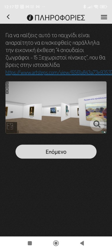 Για το project δημιουργήθηκε ένας χώρος εικονικής έκθεσης (μουσείο) με 4 αίθουσες με 15 πίνακες από τους πιο διάσημους ζωγράφους παγκοσμίως (https://www.artsteps.com/view/6561a843a73e9353741c7288). Στο μουσείο εκτός από τους πίνακες, υπάρχουν πληροφορίες για αυτούς και τη ζωή των ζωγράφων καθώς και κάποια ενεργά σημεία που μπορούν να χρησιμοποιηθούν από μια εφαρμογή που αναπτύχθηκε (https://actionbound.com/bound/aketh-pirates-2024). Η εφαρμογή μπορεί να λειτουργήσει σε έξυπνες συσκευές δίνοντας την ευκαιρία στους επισκέπτες του μουσείου να ανακαλύψουν κάθε έκθεμα σε αυτό με παιγνιώδη τρόπο.