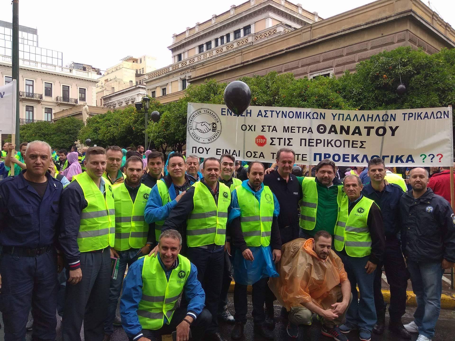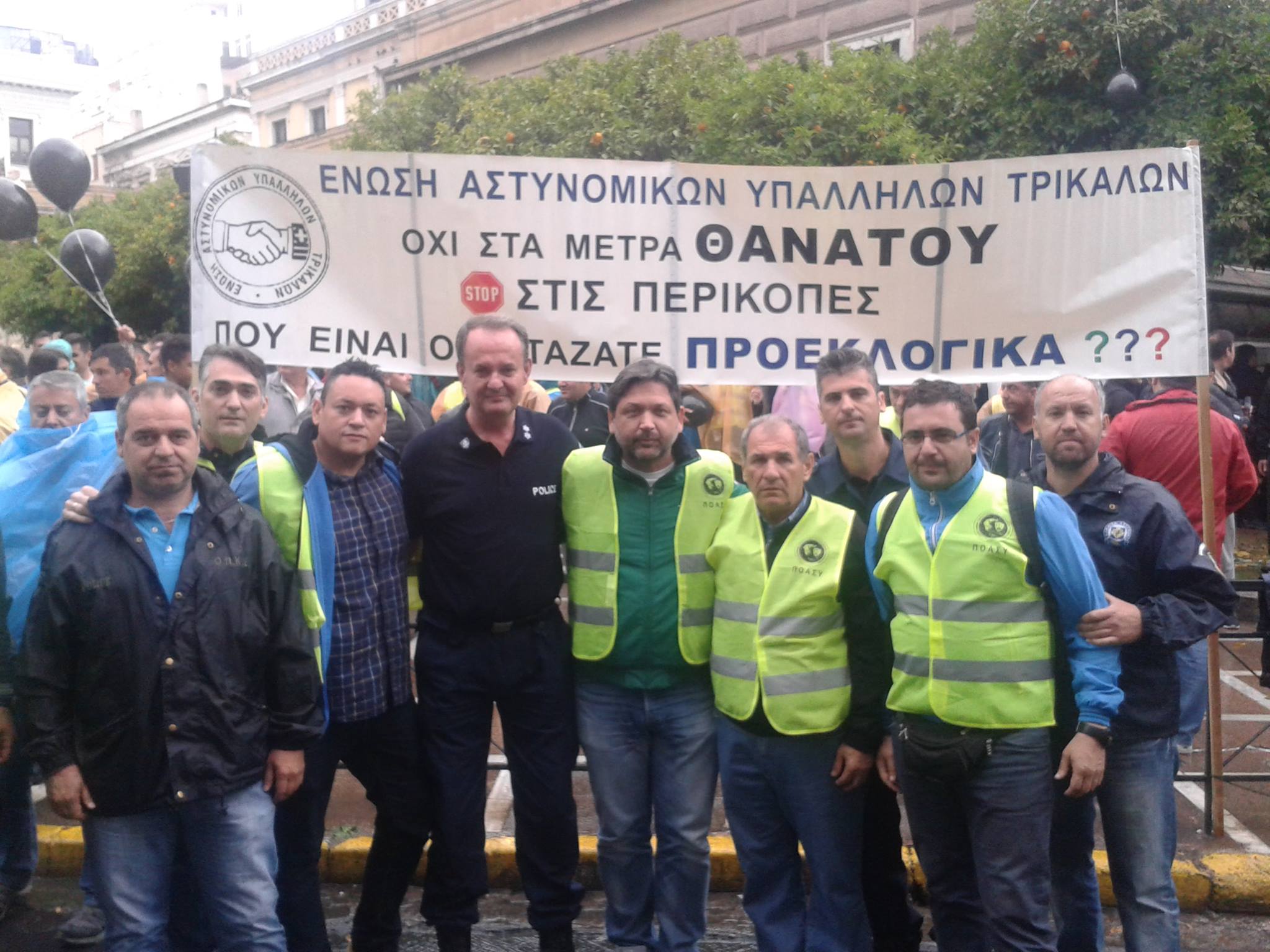 Με μαύρα μπαλόνια στα χέρια και με συνθήματα εναντίον των νέων μέτρων που φέρνει η κυβέρνηση με βάση τη συμφωνία με τους δανειστές διαδηλώνουν στην Αθήνα, Τρικαλινοί αστυνομικοί.