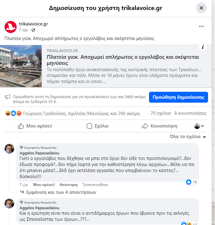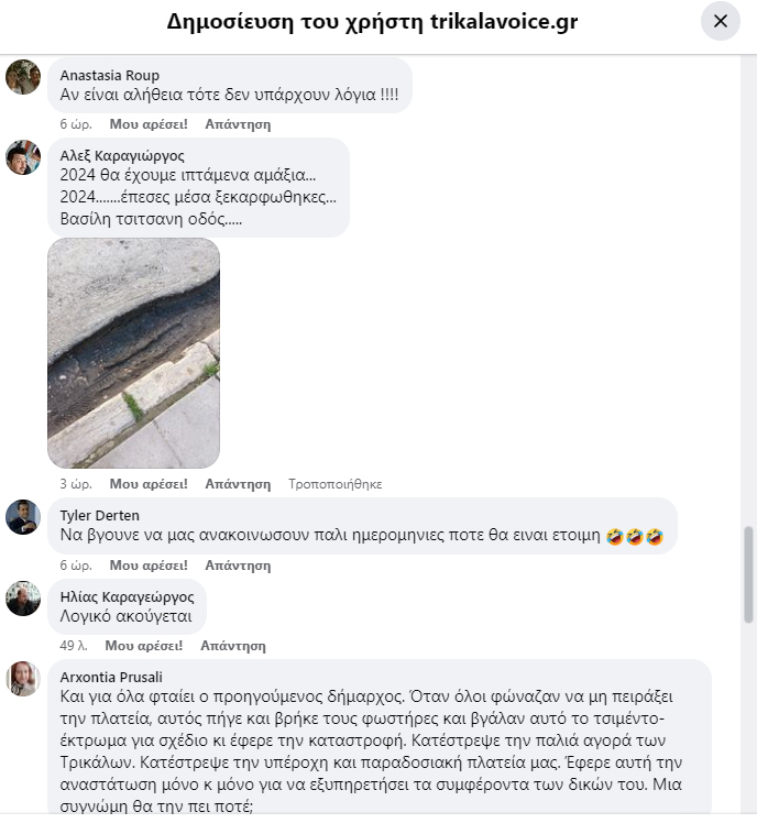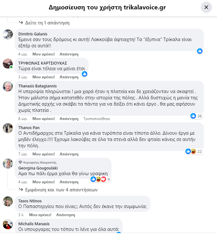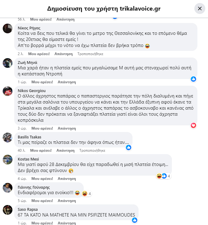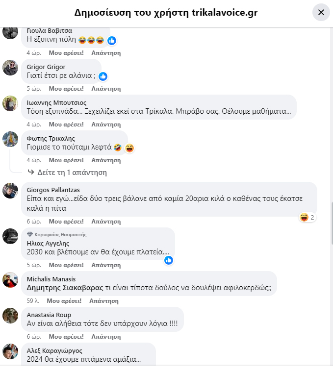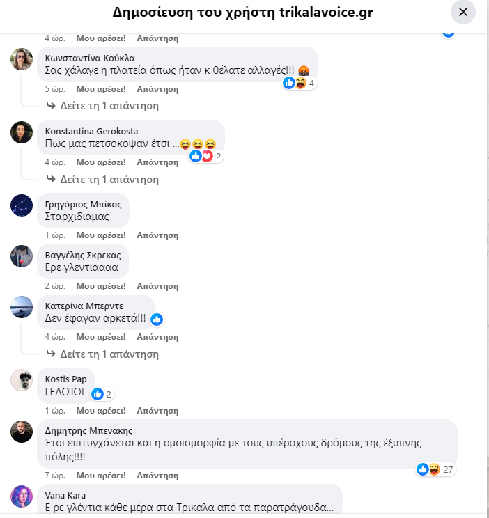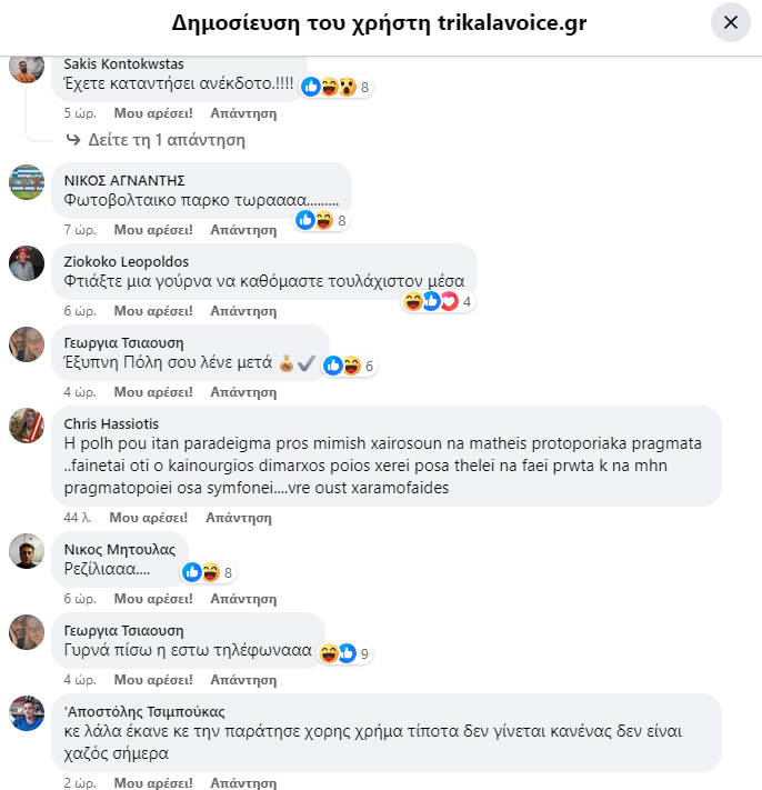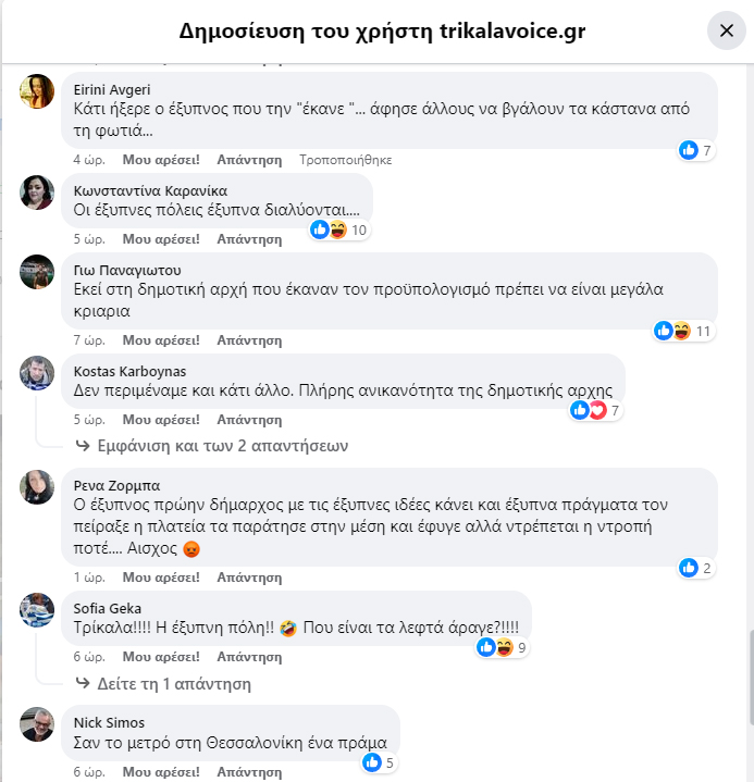 Οι χρήστες των social media επιρρίπτουν ευθύνες στη Δημοτική Αρχή και ρίχνουν… φαρμακερά σχόλια. Δείτε μόνο ορισμένα από την επίσημη σελίδα του trikalavoice.gr στο facebook: