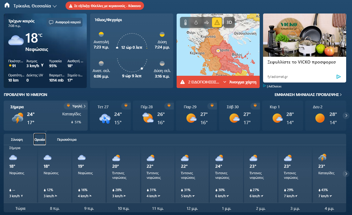Όπως κατέγραψε το trikalavoice.gr δημιουργήθηκαν προβλήματα μέσα στην πόλη (δείτε ΕΔΩ κι ΕΔΩ), αλλά και στα χωριά της περιοχής. Ευτυχώς άντεξαν τα ποτάμια και δεν είχαμε επανάληψη της εφιαλτικής 7ης Σεπτεμβρίου. Όπως δηλώνει στο trikalavoice.gr ο δήμαρχος Τρικκαίων Νίκος Σακκάς, ο οποίος παρέμενε στο αμαξοστάσιο του Δήμου μέχρι τις 4 τα ξημερώματα, “έπεσαν 60 χιλιοστά βροχής μέσα σε μια ώρα κατά τη διάρκεια της νύχτας. Ανταποκριθήκαμε και οι ζημιές που προκλήθηκαν αποκαταστάθηκαν άμεσα”. Για σήμερα ο καιρός προβλέπεται βελτιωμένος και καταιγίδες θα σημειωθούν μόνο τις απογευματινές ώρες: