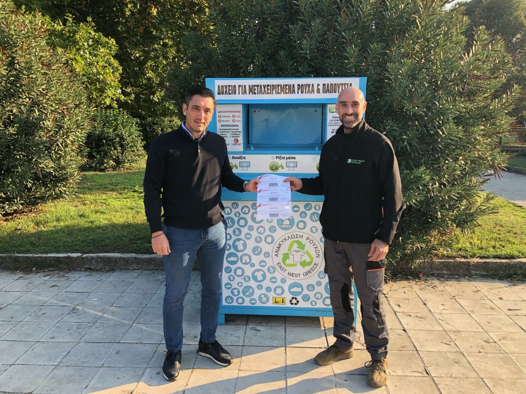 Την πρώτη επιταγή στον Δήμο Τρικκαίων, ως ανταποδοτικό όφελος από την ανακύκλωση ρούχων, παρέλαβαν οι αρμόδιοι αντιδήμαρχοι. Πρόκειται για το σύστημα ανακύκλωσης ρούχων σε κάδους που τοποθέτησε ο Δήμος Τρικκαίων σε 16 σημεία της πόλης, συνεργαζόμενος πλέον με την εταιρεία East West Greece.