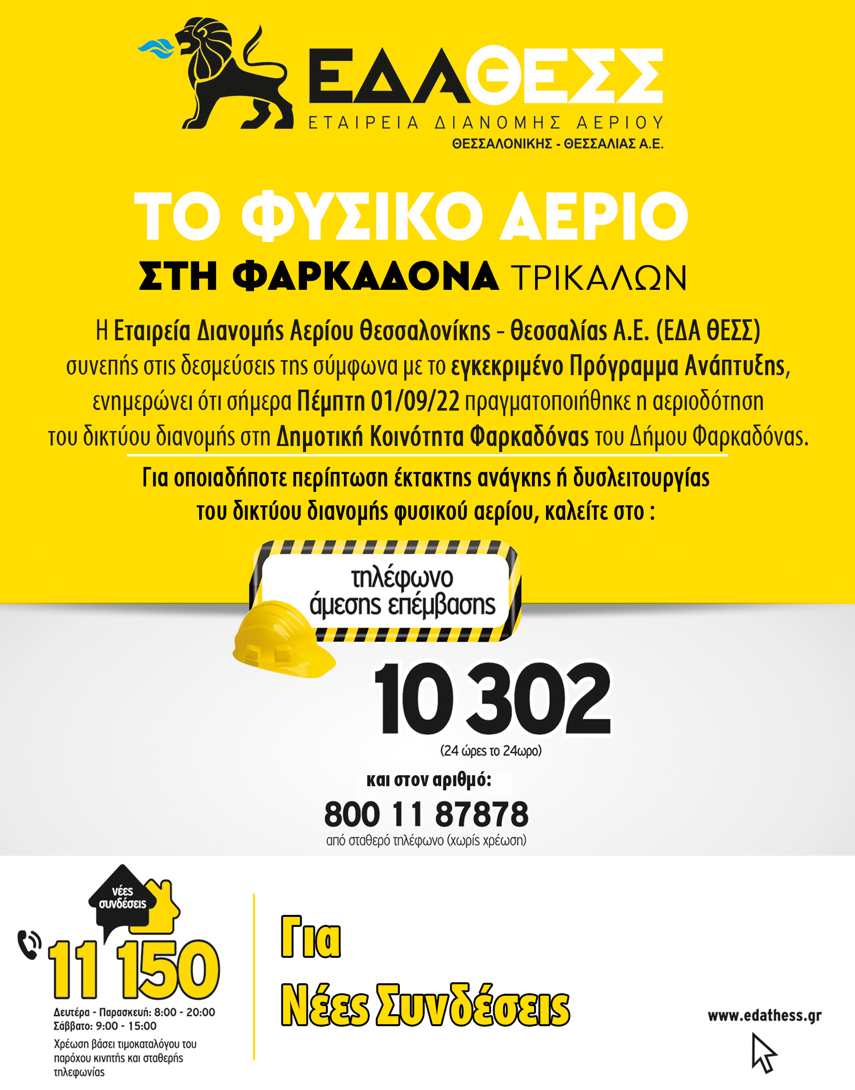 Η ΕΔΑ ΘΕΣΣ ενημερώνει ότι σήμερα Πέμπτη 01/09/2022, πραγματοποιήθηκε η αεριοδότηση του δικτύου διανομής στη Δημοτική Κοινότητα Φαρκαδόνας του Δήμου Φαρκαδόνας.