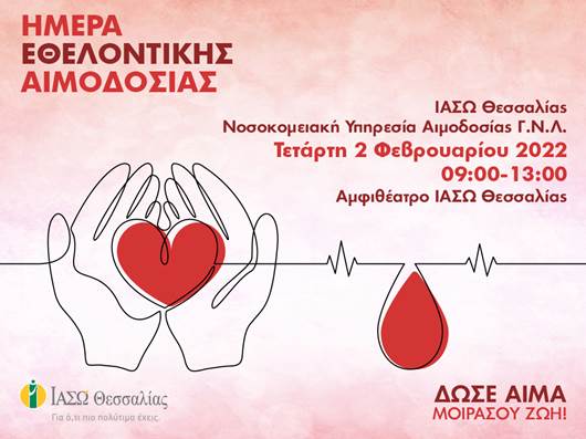 Το ΙΑΣΩ Θεσσαλίας, σε συνεργασία με την κινητή μονάδα αιμοδοσίας του Γενικού Νοσοκομείου Λάρισας, οργανώνει εθελοντική αιμοδοσία στο Αμφιθέατρο της Κλινικής, την Τετάρτη 02 Φεβρουαρίου 2022 και ώρες 09:00 π.μ. – 13:00 μ.μ.