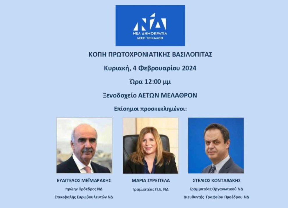 Εκδήλωση κοπής πίτας διοργανώνει η ΔΕΕΠ Ν.Δ. Τρικάλων την Κυριακή 4 Φεβρουαρίου στις 12 μ. στο ΑΕΤΩΝ ΜΕΛΑΘΡΟΝ.