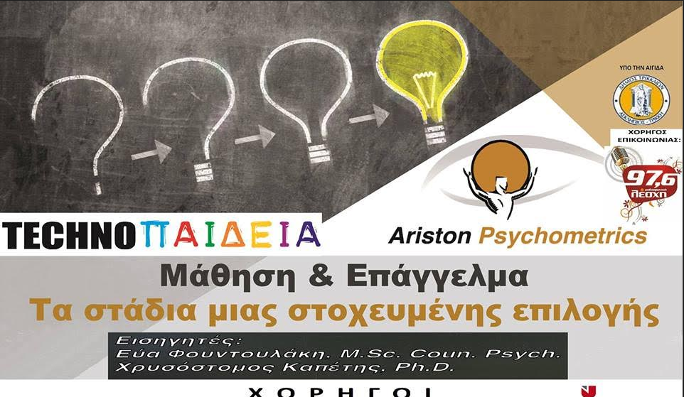 Η TechoΠΑΙΔΕΙΑ και η Ariston Psychometrics διοργανώνουν υπό την αιγίδα του Δήμου Τρικκαίων, εκδήλωση με θέμα «Μάθηση & Επάγγελμα – Τα στάδια μιας στοχευμένης επιλογής» που θα πραγματοποιηθεί στις 3 Μαρτίου 2018, Ώρα 18:00 στο Πνευματικό Κέντρο Τρικάλων:
