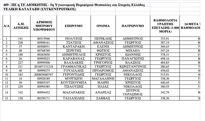 Εκδόθηκαν το απόγευμα της Πέμπτης από το ΑΣΕΠ οι τελικοί πίνακες με τους υποψήφιους Διοικητές ΥΠΕ που προκρίνονται στον γραπτό διαγωνισμό.