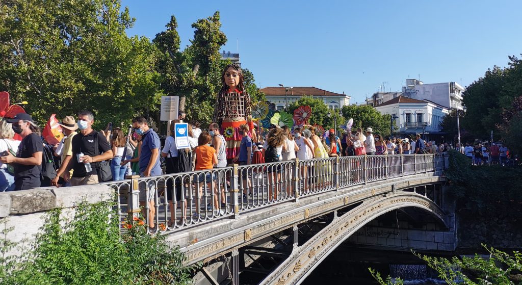 Αμέσως μετά, συνοδεία των μικρών τρικαλινών και των οικογενειών τους, με την τήρηση των υγειονομικών πρωτοκόλλων, περπατώντας δίπλα από τον ποταμό (σε έναν συμβολισμό για την όμορφη τρικαλινή φύση) η Αμάλ στάθηκε στην κεντρική πεζογέφυρα των Τρικάλων. Εκεί χαιρέτισε με υπόκλιση το άγαλμα του Ασκληπιού, του αρχαίου θεού της Ιατρικής, του πρώτου γιατρού της ανθρωπότητας, που θεράπευε στις όχθες του Ληθαίου ποταμού.