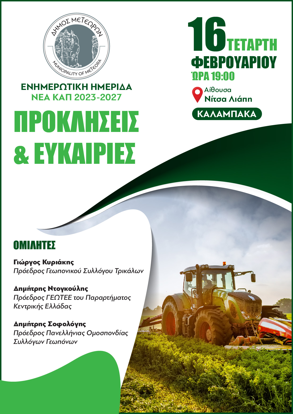 Ενημερωτική ημερίδα για τη νέα ΚΑΠ 2023 -2027 με τίτλο: «Προκλήσεις και Ευκαιρίες» διοργανώνει η Αντιδημαρχία Παραγωγικής Ανάπτυξης, Γεωργίας και Κτηνοτροφίας του Δήμου Μετεώρων.