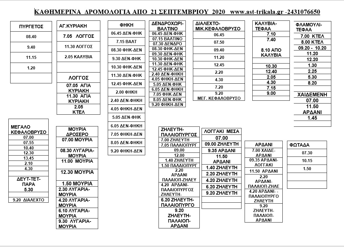 Γίνεται γνωστό στο επιβατικό κοινό ότι από τη Δευτέρα 21 Σεπτεμβρίου τίθεται σε εφαρμογή το χειμερινό πρόγραμμα δρομολογίων του Αστικού ΚΤΕΛ Τρικάλων. Για περισσότερες πληροφορίες μπορείτε να απευθύνεστε στο σταθμαρχείο, στον τερματικό σταθμό ή στο τηλέφωνο 2431076650-1 και στην ιστοσελίδα www.ast-trikala.gr/ και στη σελίδα του Αστικού ΚΤΕΛ στο facebook.