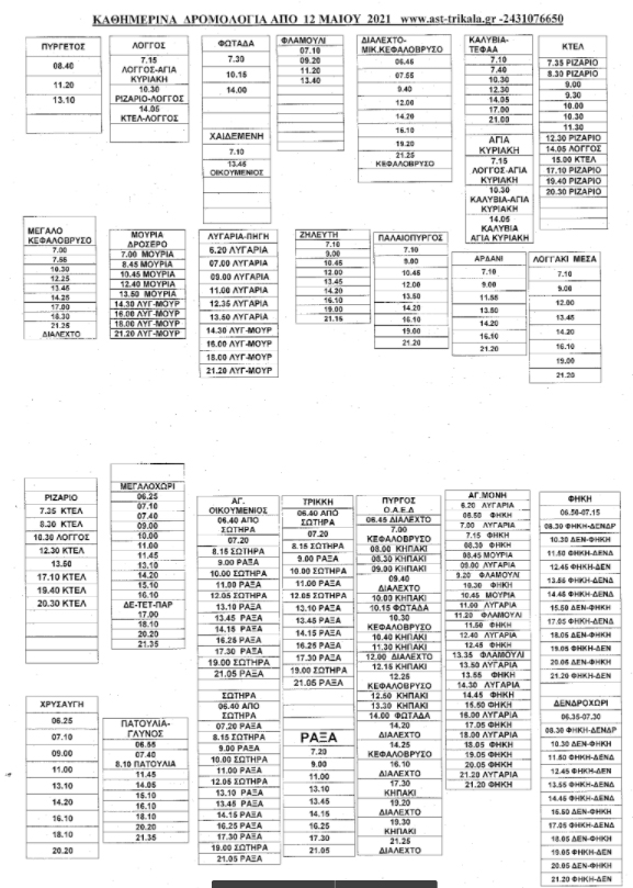 Το Αστικό ΚΤΕΛ Τρικάλων συμβάλλοντας αποφασιστικά στις ασφαλείς μετακινήσεις των πολιτών του ν. Τρικάλων ενισχύει περαιτέρω τα δρομολόγιά του από την Τετάρτη 12 Μαϊου, τόσο το πρωί, όσο και το απόγευμα ως εξής: