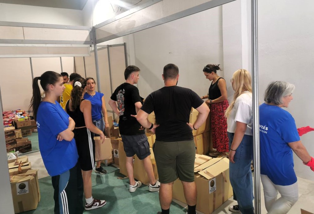 Εκεί, όπου οι τρικαλινοί/ες εθελοντές/τριες οργανώνονται και οργανώνουν όλη τη βοήθεια, όλα τα προϊόντα, όλα τα είδη που απευθύνονται στους πλημμυροπαθείς. Νέα παιδιά κυρίως, περνούν ώρες από τον προσωπικό τους χρόνο, για να ενισχύσουν όπου μπορούν, όσους δεν μπορούν.