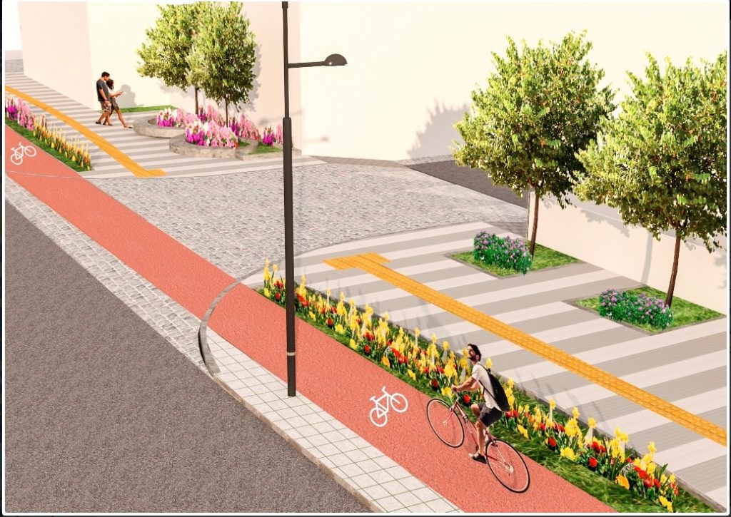 Εκατέρωθεν και κατά μήκος της οδού θα είναι εγκιβωτισμένος στην στάθμη του πεζοδρομίου, ο ποδηλατόδρομος σταθερού πλάτους 1,50μ. μονής κατεύθυνσης, κατά την φορά των αυτοκινήτων με τελική επίστρωση έγχρωμου-κόκκινου βιομηχανικού δαπέδου, μετά της απαιτουμένης υπόβασης από οπλισμένο σκυρόδεμα, αφού πρώτα προηγηθεί η κατασκευή πλακοστρωμένης ζώνης συνολικού πλάτους 0,70μ. για την ασφάλεια του ποδηλάτη. Η ζώνη πρασίνου θα αναπτυχθεί μεταξύ του ποδηλατοδρόμου και του πεζοδρομίου μεταβλητού πλάτους 0,60-2,00μ. ανάλογα με το πλάτος του πεζοδρομίου. Τα πεζοδρόμια εκατέρωθεν, μεταβλητού πλάτους 2-3μ. κατασκευάζονται με έγχρωμες αντιολισθητικές πλάκες πεζοδρομίου. Στα σημεία διασταύρωσης κατασκευάζονται ανισόπεδες διαβάσεις με τελική επίστρωση κυβόλιθου, ενώ στα σημεία όπου απαιτείται διαμορφώνονται ράμπες κλίσης 5% για την εξυπηρέτηση των ΑμεΑ . Η λειτουργικότητας της παρέμβασης ολοκληρώνεται με τις απαραίτητες Η/Μ εργασίες για τη δημιουργία νέου δικτύου ηλεκτροφωτισμού. Επομένως θα βελτιώσει τη λειτουργικότητα της περιοχής παρέμβασης και θα αναβαθμίσει το περιβάλλον και την ποιότητα ζωής των κατοίκων, ενώ μακροπρόθεσμα θα έχει θετικές επιπτώσεις στο επίπεδο της δημόσιας υγείας, στις συνθήκες κλιματικών αλλαγών και γενικότερα στις συνθήκες διαβίωσης του πληθυσμού.