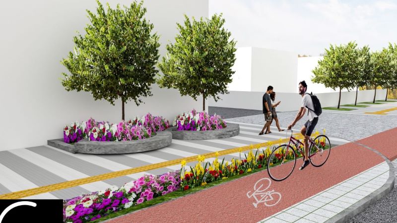 Εκατέρωθεν και κατά μήκος της οδού θα είναι εγκιβωτισμένος στην στάθμη του πεζοδρομίου, ο ποδηλατόδρομος σταθερού πλάτους 1,50μ. μονής κατεύθυνσης, κατά την φορά των αυτοκινήτων με τελική επίστρωση έγχρωμου-κόκκινου βιομηχανικού δαπέδου, μετά της απαιτουμένης υπόβασης από οπλισμένο σκυρόδεμα, αφού πρώτα προηγηθεί η κατασκευή πλακοστρωμένης ζώνης συνολικού πλάτους 0,70μ. για την ασφάλεια του ποδηλάτη. Η ζώνη πρασίνου θα αναπτυχθεί μεταξύ του ποδηλατοδρόμου και του πεζοδρομίου μεταβλητού πλάτους 0,60-2,00μ. ανάλογα με το πλάτος του πεζοδρομίου. Τα πεζοδρόμια εκατέρωθεν, μεταβλητού πλάτους 2-3μ. κατασκευάζονται με έγχρωμες αντιολισθητικές πλάκες πεζοδρομίου. Στα σημεία διασταύρωσης κατασκευάζονται ανισόπεδες διαβάσεις με τελική επίστρωση κυβόλιθου, ενώ στα σημεία όπου απαιτείται διαμορφώνονται ράμπες κλίσης 5% για την εξυπηρέτηση των ΑμεΑ . Επιπλέον σε θέσεις με έντονη υψομετρική διαφορά κατασκευάζονται τοίχοι αντιστήριξης για την προσαρμογή της στάθμης του πεζοδρομίου. Η λειτουργικότητας της παρέμβασης ολοκληρώνεται με τις απαραίτητες Η/Μ εργασίες για τη δημιουργία νέου δικτύου ηλεκτροφωτισμού.