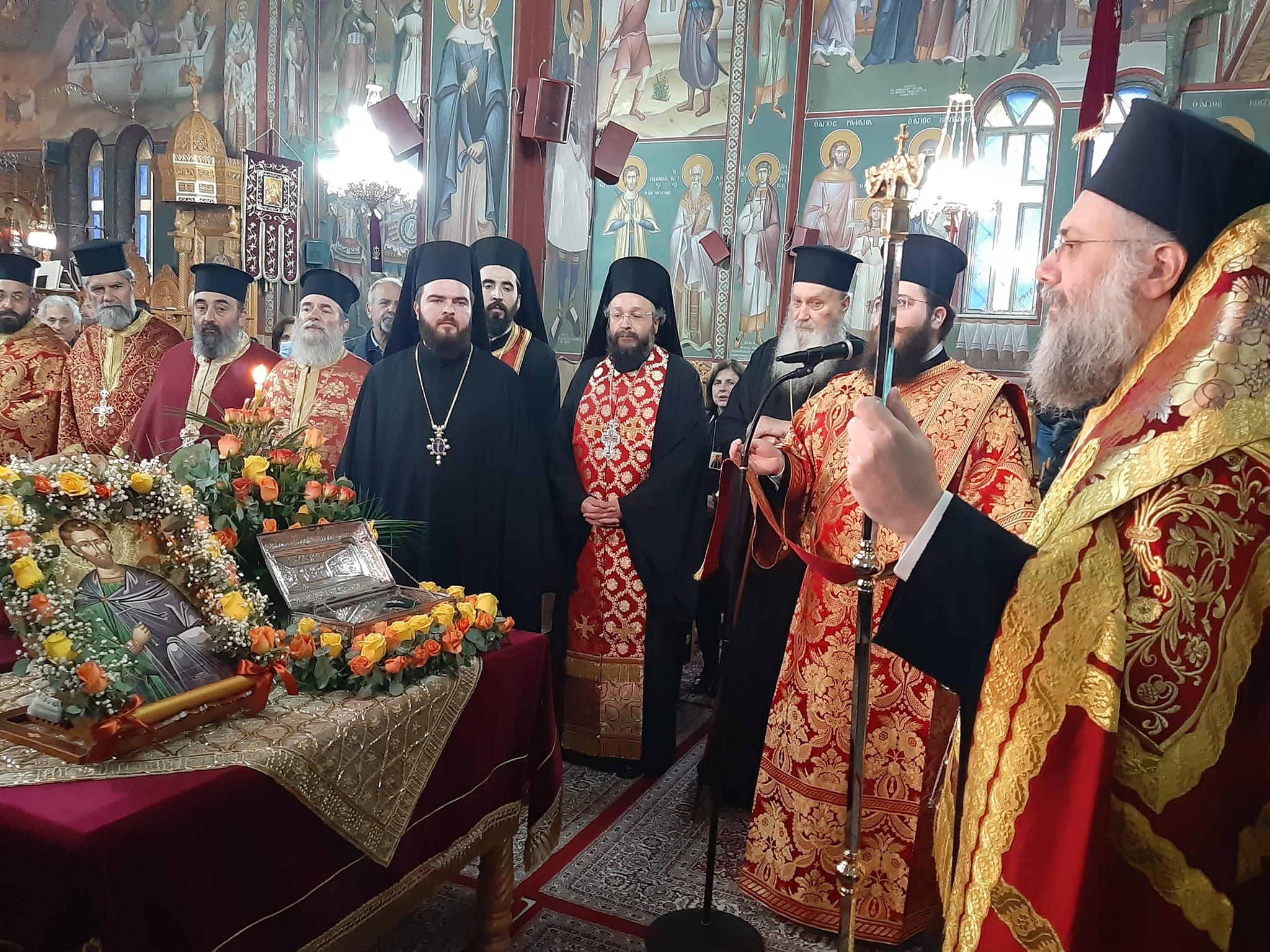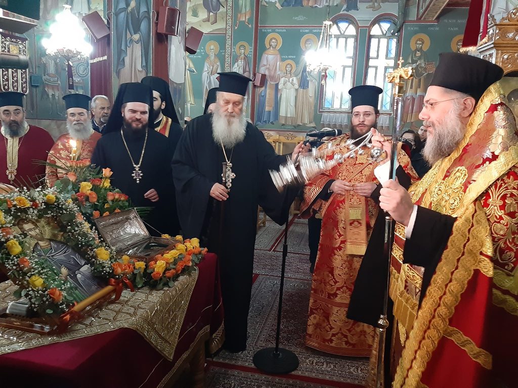 Όπως κατέγραψε το trikalavoice.gr η υποδοχή έγινε υπό του Μητροπολίτου Τρίκκης Χρυσοστόμου στα προπύλαια του φερώνυμου Ναού στην Πράσινη Γωνιά και ακολούθησε πανηγυρικός Εσπερινός. Έπειτα μίλησε για τον ηγιασμένο βίο αυτού ο καθηγητής Μιχαήλ Τρίτος. Αξίζει να σημειωθεί ότι δεξιά χείρα του Αγίου κομίστηκε στα Τρίκαλα εκ της Μητροπόλεως Ιωαννίνων χάρη στις προσπάθειες του ευλαβεστάτου εφημερίου του Ιερού Ναού Αγίου Νικολάου εκ Μετσόβου, πατρός Δημητρίου Κυρίτση.