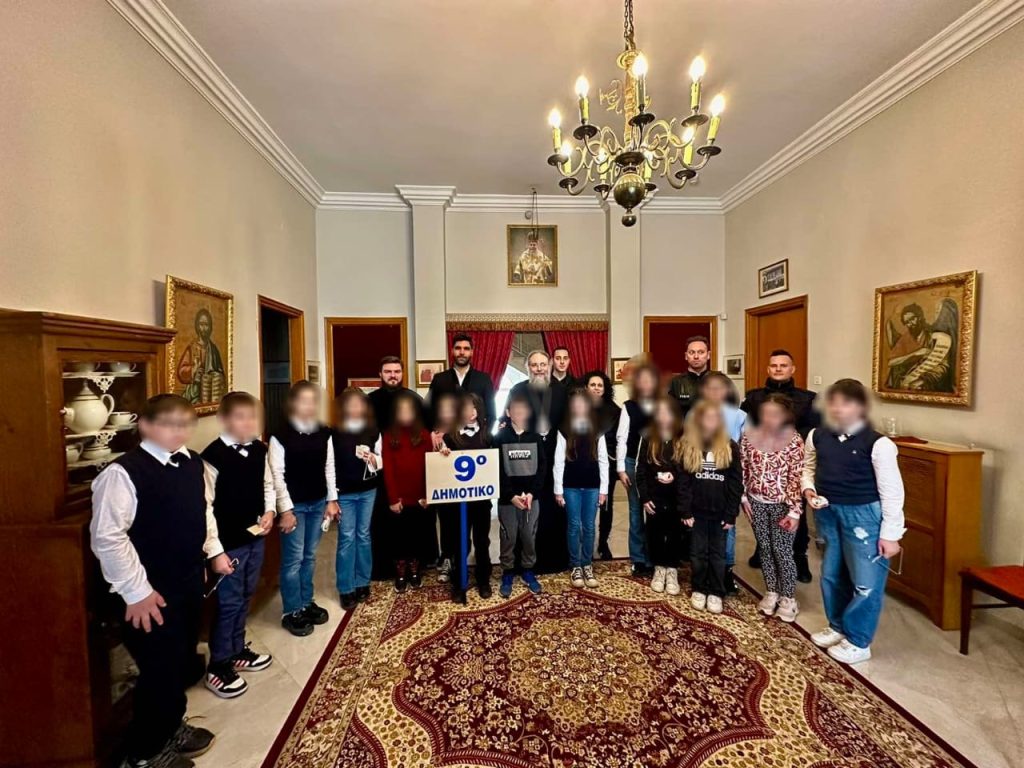 Ο Διευθυντής του σχολείου κ. Σωτήρης Βουσιόπουλος και η δασκάλα της ΣΤ’ Τάξης κ. Μαρίνα Αγγελάκη, οδήγησαν τους μαθητές σε μια σημαντική επίσκεψη στον Σεβασμιώτατο, προκειμένου να του τραγουδήσουν τα παραδοσιακά κάλαντα και να ανταλλάξουν ευχές για τα Χριστούγεννα.