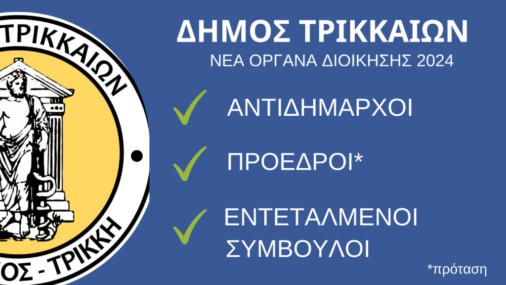 Τους νέους αντιδημάρχους για τη δημοτική περίοδο που ξεκινά την 1η Ιανουαρίου 2024 ανακοινώνει Δήμαρχος Τρικκαίων Νίκος Σακκάς. Πρόκειται για 8 αντιδημάρχους και τις προτάσεις για προέδρους 5 οργανισμών του Δήμου Τρικκαίων, καθώς και 4 εντεταλμένους συμβούλους.