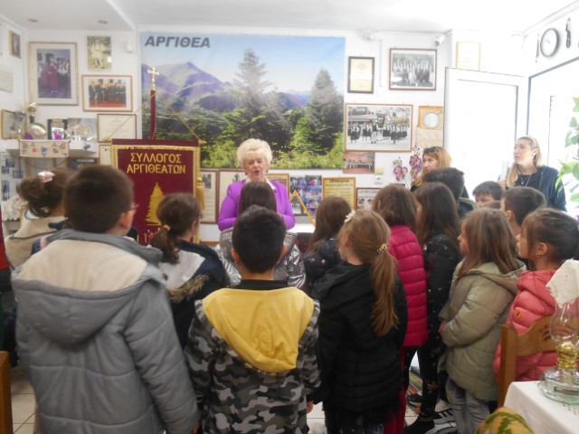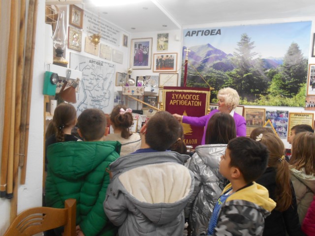 εντυπωσιάστηκαν πολύ με τον αργαλειό, όπου η κ. Παναγιώτα Κωτή ύφαινε ένα διάδρομο. Μετά από μια ώρα ξενάγηση η κ. Δήμητρα Γιώτη κέρασε τα παιδιά  καραμέλες ,λουκουμάκι, και σπιτικά τυροπιτάκια. Οι Αργιθεάτες φημίζονται για τη φιλοξενία τους.