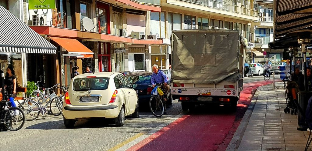 Δυστυχώς ανάλογα περιστατικά συμβαίνουν καθημερινά, φέρνουν εντάσεις και πολλές φορές τραυματισμούς. Στη φωτό διακρίνεται ένα… σταματημένο φορτηγό πάνω στον «ποδηλατόδρομο» (παράνομα), ένας ποδηλάτης που κινείται ανάποδα στον «ποδηλατόδρομο» (… δεν έχει υπάρξει επίσημη ενημέρωση ότι ΑΠΑΓΟΡΕΥΕΤΑΙ η αντίθετη κίνηση επί αυτού) και δυο αυτοκίνητα που προσπαθούν να κινηθούν και να… διαφύγουν της οδού Αμαλίας. Για την ιστορία δευτερόλεπτα μετά ο ποδηλάτης έπεσε πάνω στο αυτοκίνητο, αλλά δεν τραυματίστηκε ευτυχώς!…