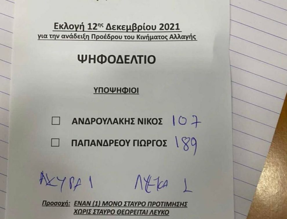 Συγκεκριμένα ο πρώην πρωθυπουργός έλαβε 189 ψηφοδέλτια, έναντι 107 του Νίκου Ανδρουλάκη.