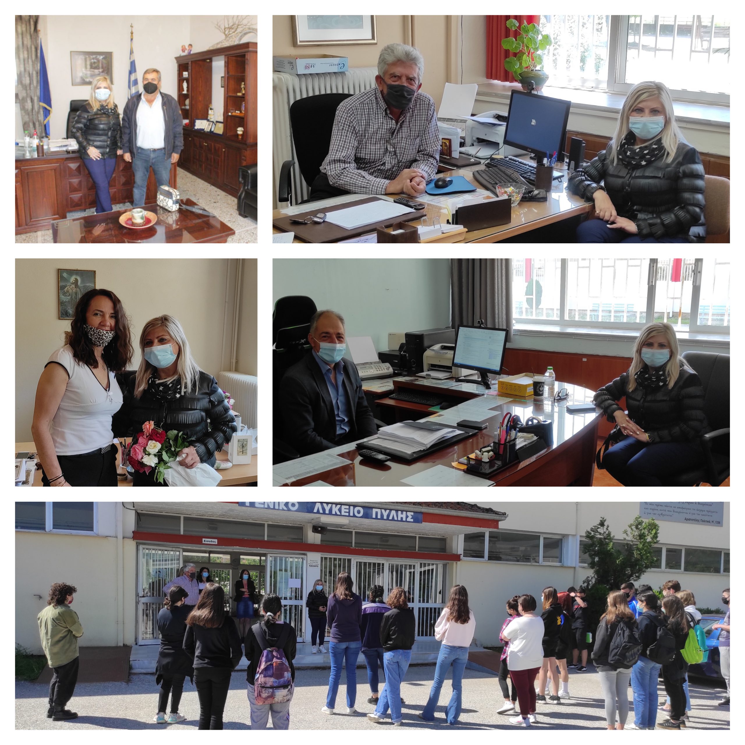 Στη συνέχεια, την Πέμπτη στις 13-05-2021, επισκέφθηκε τα σχολεία της Πύλης, το Γυμνάσιο, το ΓΕ.Λ και το ΕΠΑ.Λ. και πραγματοποίησε επίσκεψη στο Δήμαρχο του Δήμου Πύλης, κ. Μαράβα Κωνσταντίνο. Στα σχολεία είχε την ευκαιρία να ενημερωθεί για τη νέα κατάσταση των αυτοδιαγνωστικών ελέγχων και άλλα θέματα που απασχολούν τα σχολεία της Περιφέρειας. Στο ΕΠΑ.Λ. η Διευθύντρια συνομίλησε με τη Διευθύντρια και το Σύλλογο Καθηγητών και για τα τμήματα Μαθητείας, ένα νέο, αλλά υποσχόμενο θεσμό, που συνδέει με άμεσο τρόπο το σχολείο με την κοινωνία.