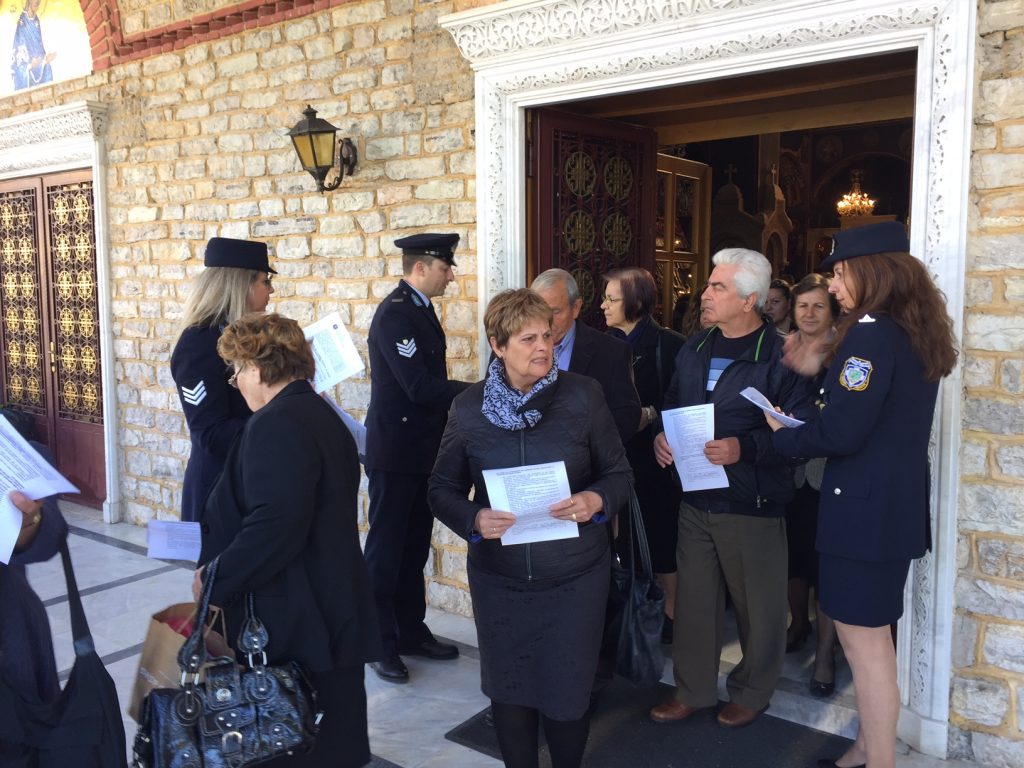 Μια ακόμη δράση προς αυτή την κατεύθυνση πραγματοποιήθηκε χθες Σάββατο (08-04-2017), με την πολύτιμη βοήθεια της Εκκλησίας. Μετά τη Θεία Λειτουργία σε Ιερούς Ναούς των Τρικάλων και συγκεκριμένα στο Μητροπολιτικό Ναό Αγίου Νικολάου, στον Άγιο Κωνσταντίνο, στην Αγία Επίσκεψη, στον Άγιο Στέφανο, στον Άγιο Νεκτάριο, στην Παναγία Φανερωμένη, στον Άγιο Κοσμά τον Αιτωλό και στον Άγιο Χαράλαμπο Ριζαριού, αστυνομικοί της Διεύθυνσης Αστυνομίας Τρικάλων διένειμαν έντυπο πληροφοριακό υλικό με χρήσιμες συμβουλές και οδηγίες για τους πολίτες.
