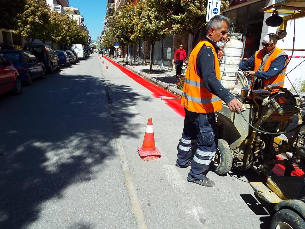 Διαγράμμιση και βαφή για τον κεντρικό ποδηλατόδρομο των Τρικάλων.Από το πρωί του Σαββάτου 2 Απριλίου 2017 ολόκληρη η διαδρομή ξεκίνησε να βάφεται με ειδικό χρώμα, εύκολα διακριτό, ως πρόσθετο μέτρο για τον σεβασμό του δρόμου διέλευσης των ποδηλάτων.