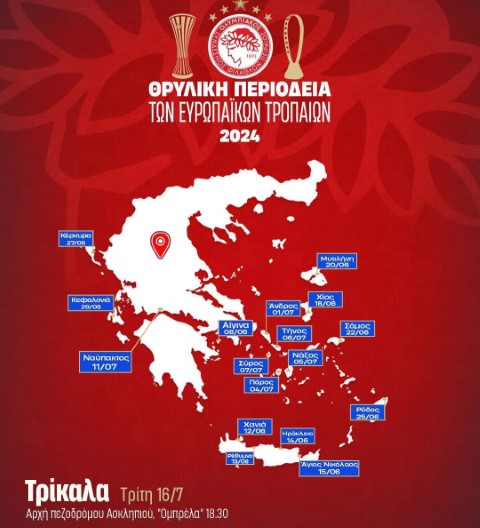 Λαμία, Τρίκαλα, Καρδίτσα και Βόλος είναι οι τέσσερις επόμενοι προορισμοί, μετά το Μεσολόγγι (12/7), τη Λευκάδα (13/7) και τα Ιωάννινα (14/7), της Θρυλικής περιοδείας των δύο Ευρωπαϊκών τροπαίων του Ολυμπιακού.