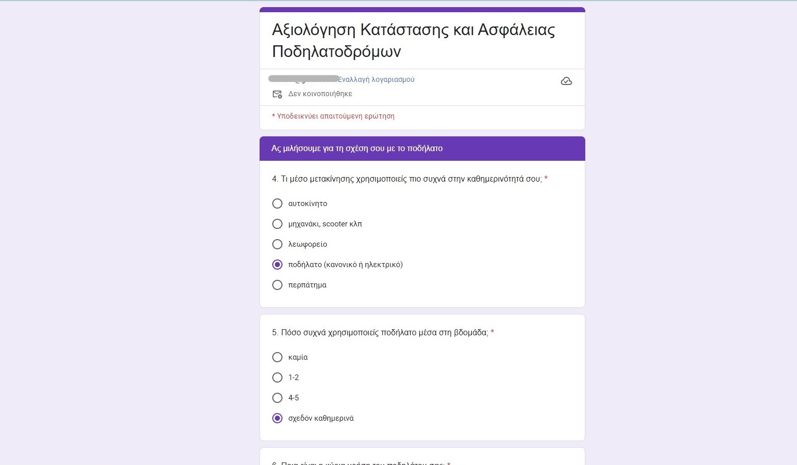 Αυτά τα ερωτήματα ουσιαστικά «ακτινογραφούν» την κατάσταση που επικρατεί, ως προς την ασφάλεια των ποδηλατών εντός του ποδηλατοδρόμου, από τη συμπεριφορά άλλων οδηγών, μέχρι γενικότερα θέματα κυκλοφοριακού στην πόλη.