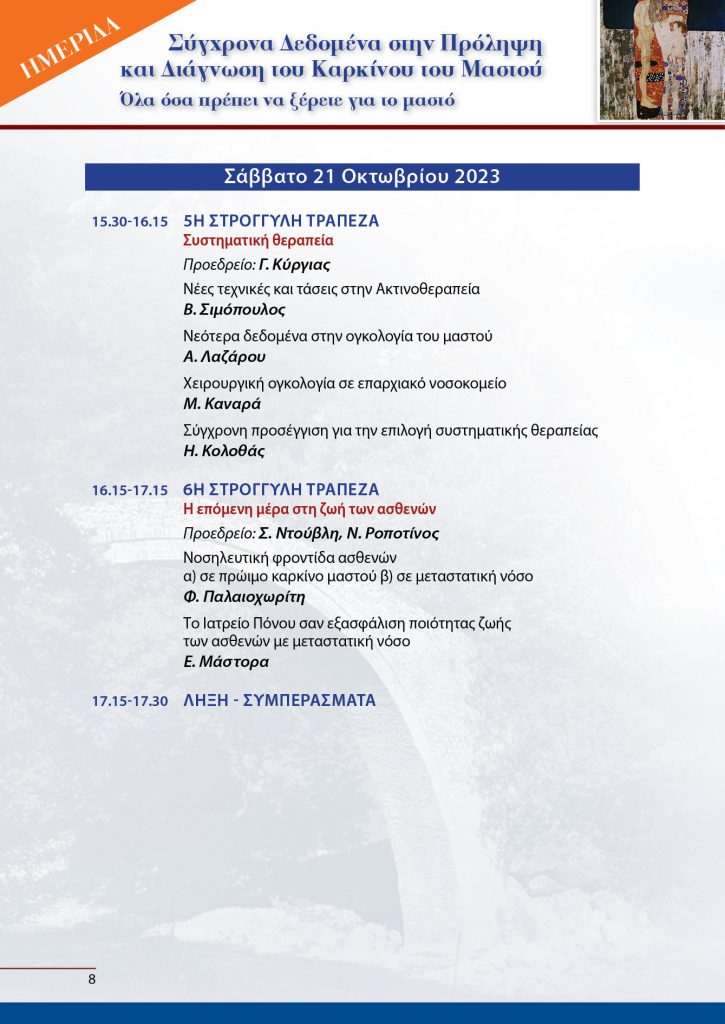 Θα επιστρατεύσουμε τη γνώση και την εμπειρία των συναδέλφων όλων των ειδικοτήτων που δραστηριοποιούνται στην περιφέρεια Θεσσαλίας και εμπλέκονται στην πρόληψη, διάγνωση και θεραπεία του καρκίνου του μαστού, ώστε να ενημερωθούμε για τα σύγχρονα δεδομένα που αφορούν την καταπολέμηση της νόσου. το επιστημονικό πρόγραμμα του Συνεδρίου θα πλαισιωθεί από αξιόλογες και ενδιαφέρουσες Στρογγυλές τράπεζες, καλύπτοντας όλα τα επιστημονικά πεδία του καρκίνου του μαστού. Στόχος μας είναι η ημερίδα να διευρύνει το πεδίο γνώσης σε μια νόσο αυξημένης συχνότητας στον γενικό πληθυσμό με ταχέως εξελισσόμενα καινούργια δεδομένα, ώστε να υπάρξουν μετά από την ανταλλαγή απόψεων μεταξύ των συναδέρφων βελτιωμένα θεραπευτικά αποτελέσματα.