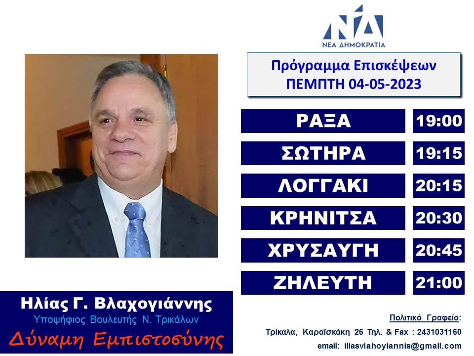 Με ιδιαίτερο ενδιαφέρον παρακολουθούν οι πολίτες τις προεκλογικές ομιλίες του πρ. Νομάρχη-Βουλευτή και εκ νέου υποψηφίου Ηλία Βλαχογιάννη.