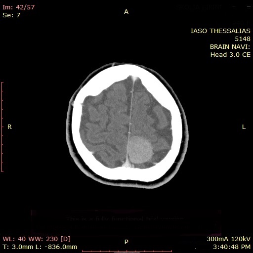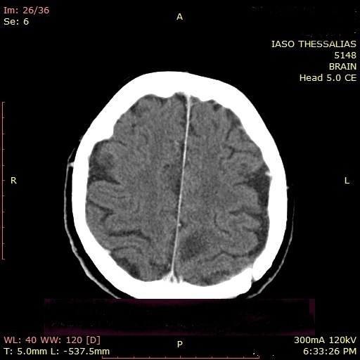 Στο ΙΑΣΩ Θεσσαλίας, στο Τμήμα Εκτάκτων Περιστατικών, προσήλθε ασθενής, 80 ετών, λόγω διαταραχής βάδισης και μείωσης επιπέδου συνείδησης. Οδηγήθηκε στην Α΄ Νευροχειρουργική Κλινική, Διευθυντής της οποίας είναι ο Δρ Βασίλειος Σλατινόπουλος, κι εκτιμήθηκε από τη Νευρολόγο, κυρία Κλαίρη Χαρισίου. Αμέσως, κρίθηκε απαραίτητη η διενέργεια αξονικής τομογραφίας εγκεφάλου στο Τμήμα Ιατρικών Απεικονίσεων, η οποία ανέδειξε εξεργασία (μηνιγγίωμα παραοβελιαίο) αριστερού εγκεφαλικού ημισφαιρίου.