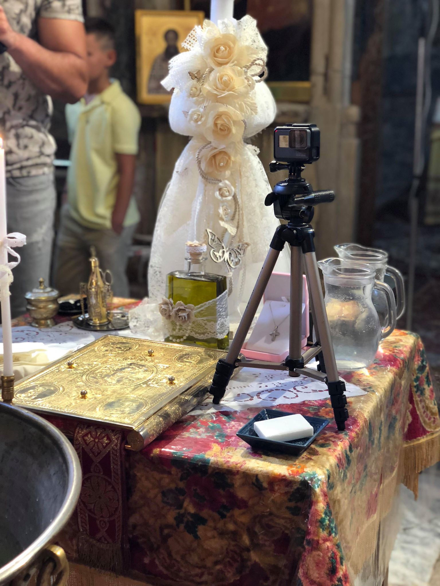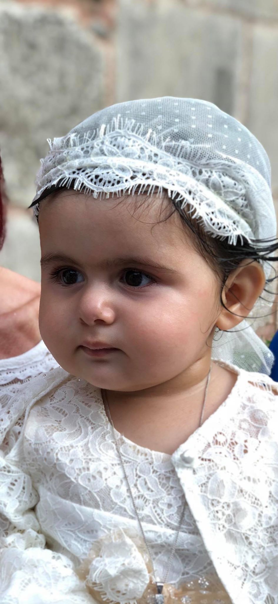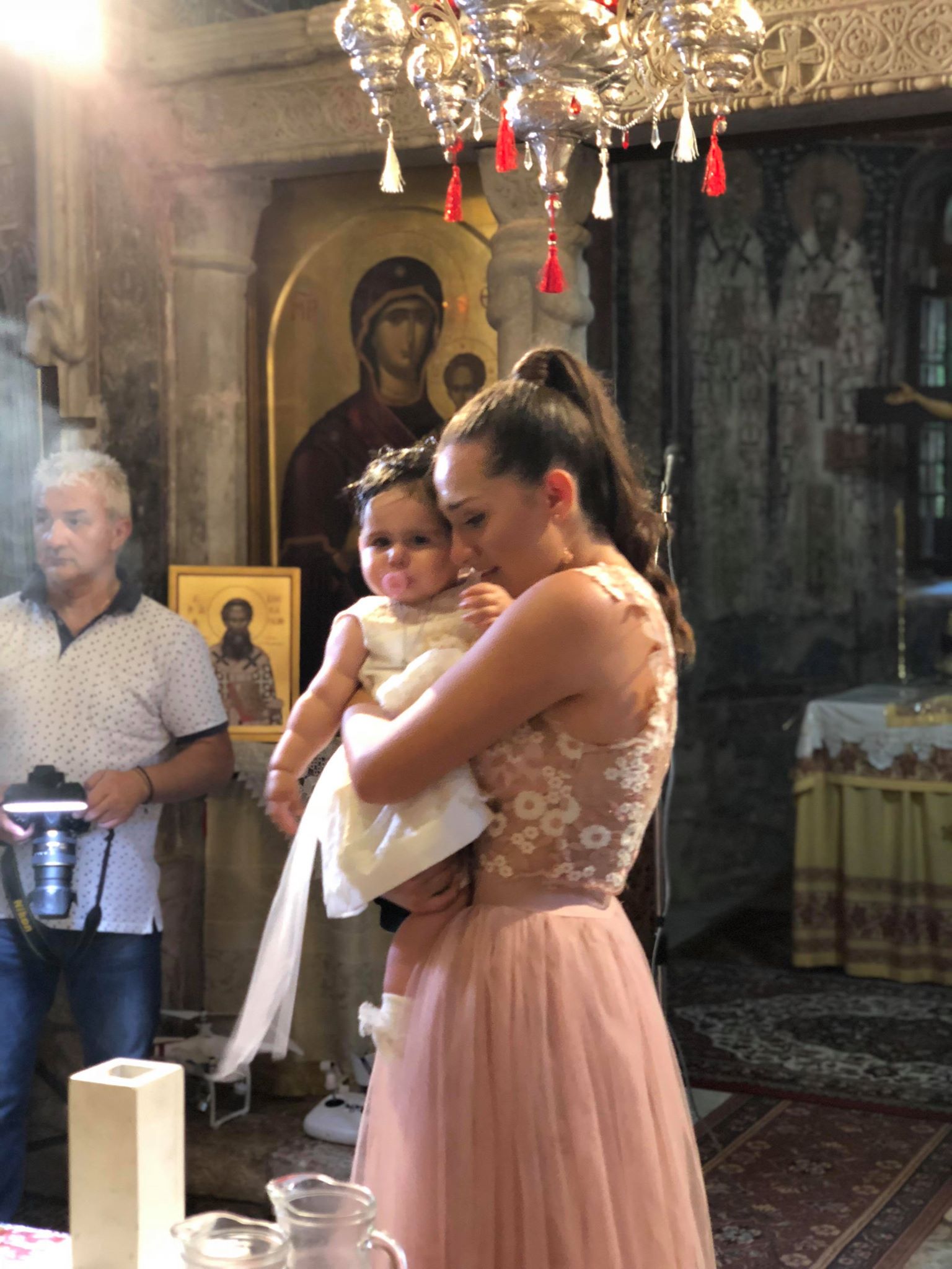 Το Μυστήριο τελέστηκε το απόγευμα της Κυριακής στο Βυζαντινό Ναό της Πόρτα Παναγιάς, με νονά τη Βένια Τζάνη. Αυτή χάρισε στη μικρή το όνομα Αντωνία!… Ακολούθησε γλέντι μέχρι πρωίας, με παραδοσιακή μουσική…