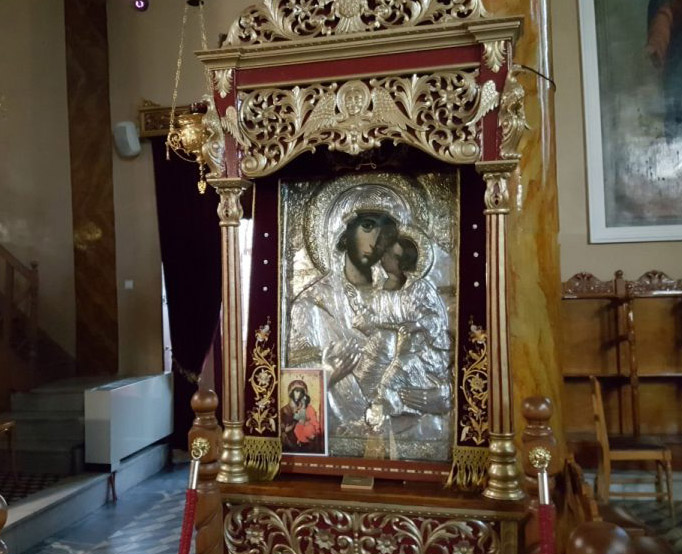 Η Παναγία, με την επιβλητική της μορφή, εικονίζεται Βρεφοκρατούσα και επιγράφεται «Η ΕΠΙΣΚΕΨΙΣ», ονομασία συνηθισμένη στη βυζαντινή εικονογραφία, αλλά μοναδική ίσως στον ελλαδικό χώρο. Σύμφωνα με επιγραφή πάνω στην Εικόνα ιστορήθηκε το έτος 1781 από τον ξακουστό αγιογράφο Αθανάσιο εκ Κορυτσάς. Η Εικόνα προέρχεται από προϋπάρχοντα παλαιό βυζαντινό Ιερό Ναό, πάνω στον οποίο κτίσθηκε το 1867 ο σημερινός περικαλλής Ναός.