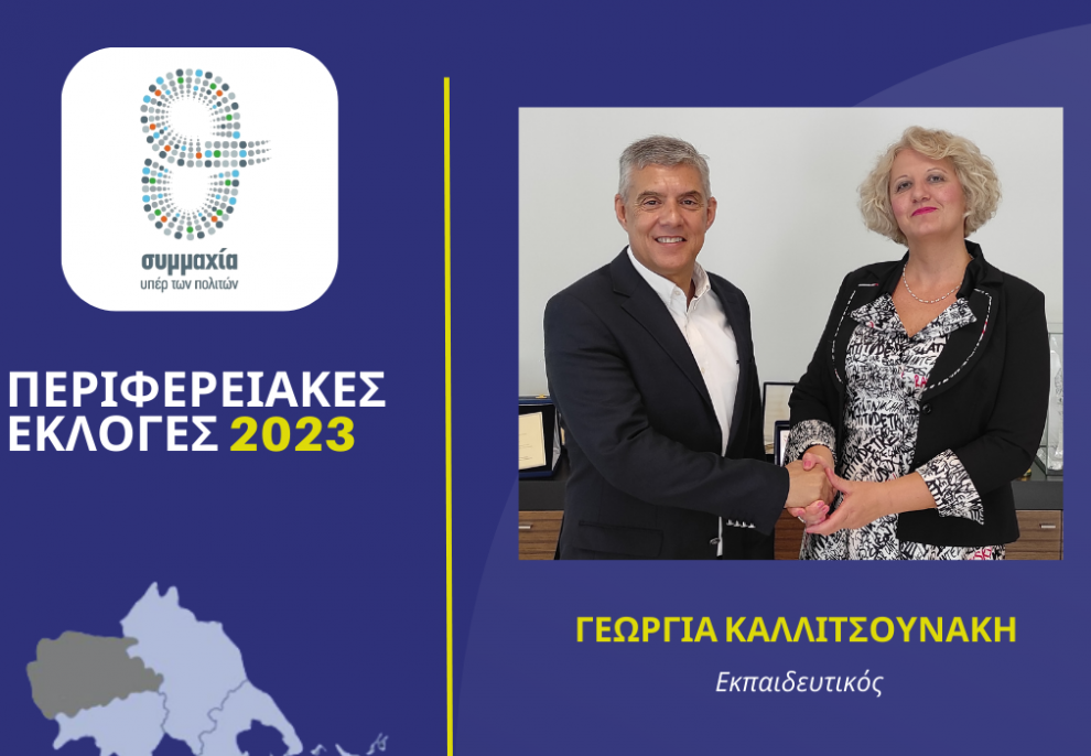 Την εκπαιδευτικό Γεωργία Καλλιτσουνάκη που κατέρχεται υποψήφια περιφερειακή σύμβουλος στην Π.Ε. Τρικάλων στις αυτοδιοικητικές εκλογές του Οκτωβρίου, καλωσόρισε ο Περιφερειάρχης Θεσσαλίας Κώστας Αγοραστός στον συνδυασμό «Συμμαχία υπέρ των πολιτών» που έχει σταθερά στο επίκεντρο τον άνθρωπο, αγωνίζεται με έργα, δράσεις, πρωτοβουλίες για μια Περιφέρεια χωρίς διακρίσεις και αποκλεισμούς.