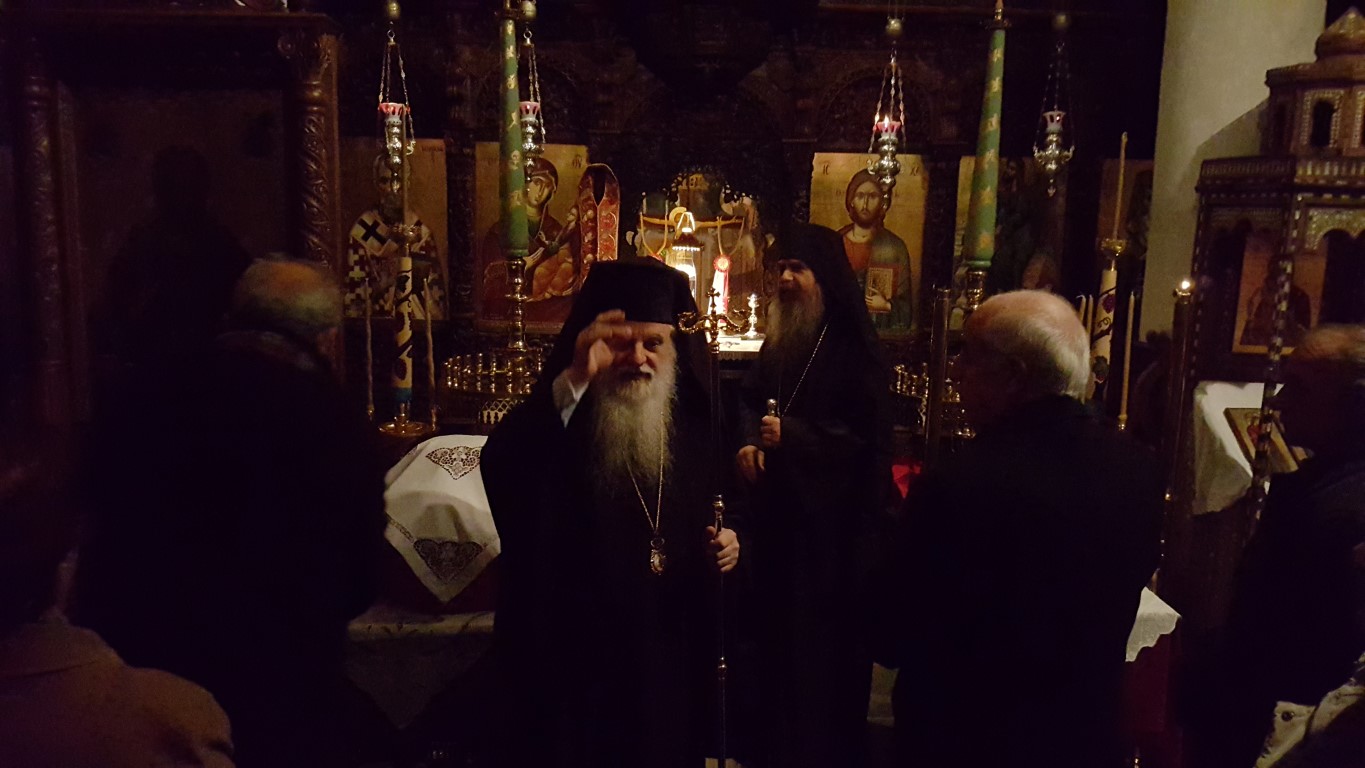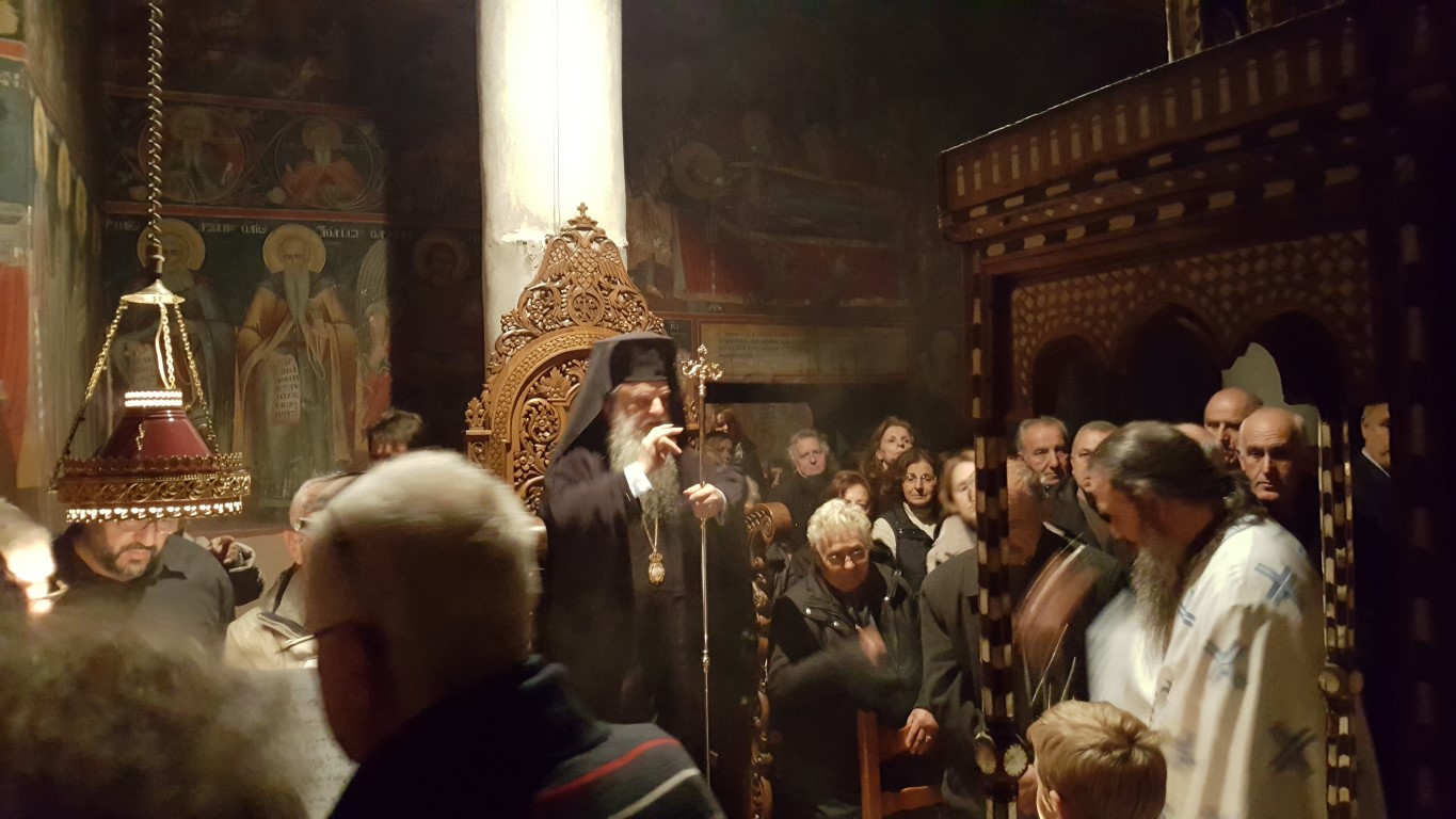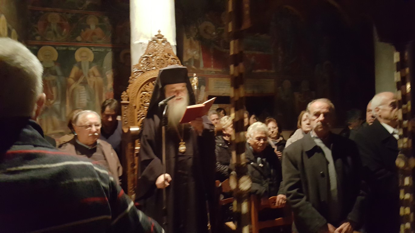 Το απόγευμα της Τρίτης, παραμονή της εορτής, τελέστηκε μέγας Αρχιερατικός Εσπερινός χοροστατούντος του Μητροπολίτου Αυλώνος Χριστοδούλου, εκ των πλέον καλλιεργημένων εκκλησιαστικών ανδρών, εγγράμματος, με εκκλησιαστικό φρόνημα και ήθος, συμμετοχή δε του Ηγουμένου της Μονής, Αρχιμανδρίτου Μακαρίου Ιακωβάκη, εκ των πλέον πνευματικών ανθρώπων της τοπικής μας Εκκλησίας.