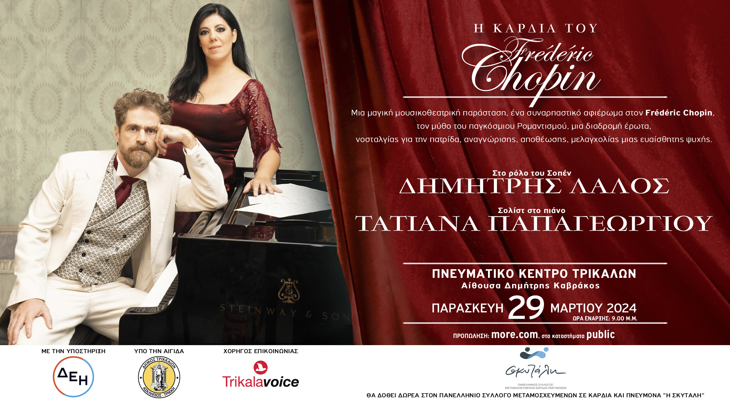 Η σπουδαία Ελληνίδα πιανίστα Τατιάνα Παπαγεωργίου (τρικαλινής καταγωγής) παρουσιάζει στα Τρίκαλα μια μαγική μουσικοθεατρική παράσταση αξιώσεων. Μαζί της, ο ηθοποιός Δημήτρης Λάλος ως ο συνθέτης Φρέντερικ Σοπέν. Την Παρασκευή 29 Μαρτίου 2024, στις 9.00 μ.μ. θα δοθεί η παράσταση «Η καρδιά του Φρεντερίκ Σοπέν», στο Πνευματικό Κέντρο Δήμου Τρικκαίων «Αθανάσιος Τριγώνης», υπό την αιγίδα του Δήμου Τρικκαίων. Τμήμα των εσόδων θα διατεθεί ως δωρεά στον Πανελλήνιο Σύλλογο Μεταμοσχευμένων σε Καρδιά και Πνευμόνια «Η σκυτάλη».