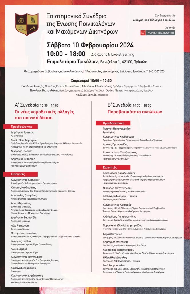 Ένα εξαιρετικά ενδιαφέρον και επίκαιρο Επιστημονικό Συνέδριο διεξάγεται στα Τρίκαλα το ερχόμενο Σάββατο με πρωτοβουλία της Ένωσης Ποινικολόγων και Μαχόμενων Δικηγόρων και συνδιοργανωτή τον Δικηγορικό Σύλλογο Τρικάλων.