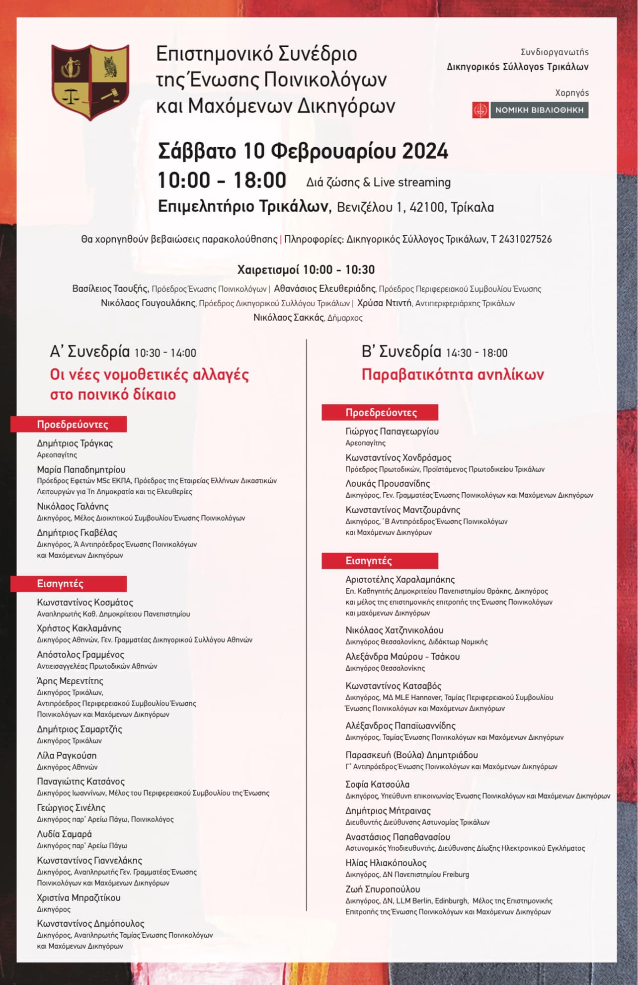 Μεταξύ άλλων κορυφαίων νομικών και επιστημόνων εισηγήσεις θα κάνουν οι Άρης Μερεντίτης, Δημήτρης Σαμαρτζής και Χριστίνα Μπραζιτίκου, ενώ θα τοποθετηθεί και ο Αστυνομικός Διευθυντής Τρικάλων Δημήτρης Μήτραινας.