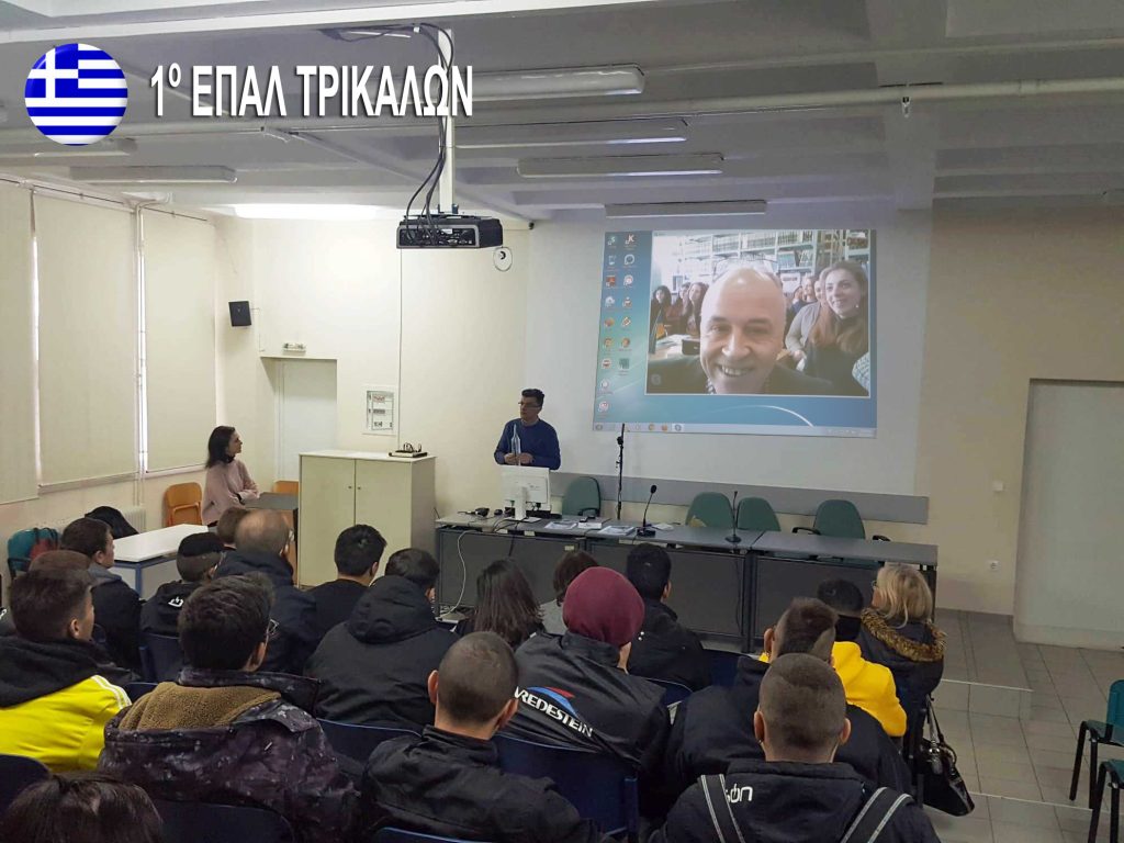 Από τα Τρίκαλα παρακολούθησαν την παρουσίαση ο Διευθυντής κ. Νικόλαος Ντόγκας, η Σχολική Σύμβουλος Φιλολόγων κα Αγγελική Φούντα, η επιβλέπουσα καθηγήτρια κα Θεοδώρα Φαλαγκάρα καθώς επίσης και οι καθηγητές /τριες και οι μαθητές /τριες της Γ΄τάξης του 1ου Επαγγελματικού Λυκείου (ΕΠΑΛ) Τρικάλων.
