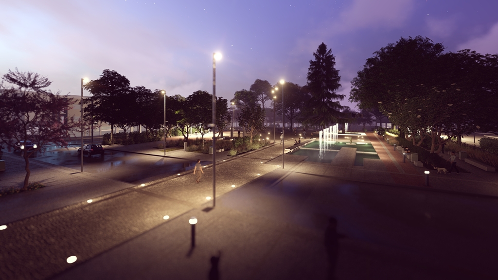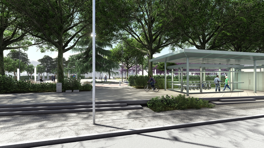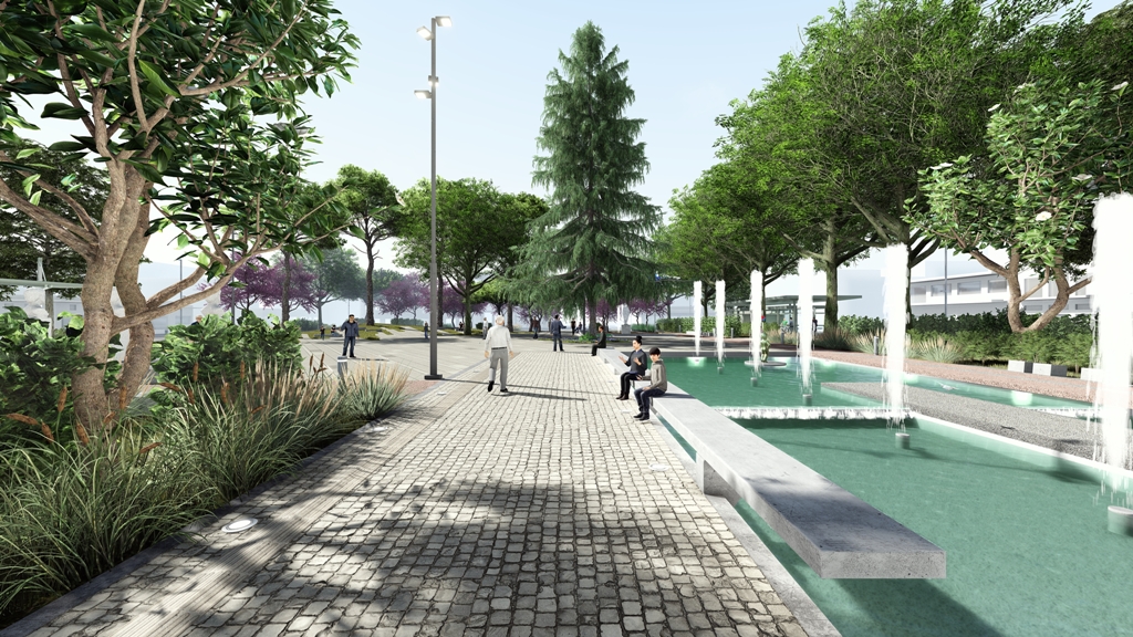– Στη βόρεια πλευρά της πλατείας διαμορφώνονται επάλληλα πλατώματα από σκυρόδεμα που συνοδεύονται από μικρές υδατοδεξαμενές, δημιουργώντας μια ατμοσφαιρική αλλά και φιλότεχνη είσοδο αφού εκεί προβλέπεται η τοποθέτηση γλυπτών.
