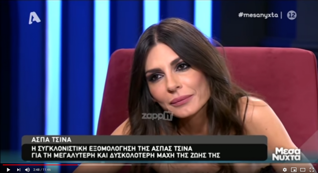 «Το πρόβλημα με την υγεία μου ξεκίνησε από έναν φρικτό πόνο στη μέση, ένιωσα ότι κόπηκα στα δύο» είπε η Άσπα Τσίνα «πριν βγει η διάγνωση εγώ γνώριζα ότι είχα κάτι πολύ σοβαρό. Μετά από ειδικές εξετάσεις έμαθα ότι έχω έναν σοβαρό καρκίνο. Στο γιο μου είπα από την αρχή ότι έχω έναν σοβαρό καρκίνο που τρώει τα κόκκαλα».