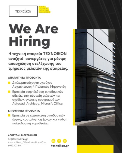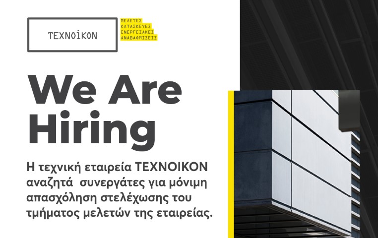 Στα πλαίσια της συνεχής ανάπτυξης και εξέλιξης αναζητά συνεργάτες Μηχανικούς για πλήρη απασχόληση για στελέχωση του τμήματος μελετών και κατασκευών της εταιρείας.