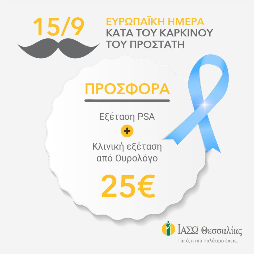 Με αφορμή την Ευρωπαϊκή ημέρα κατά του καρκίνου κατά του προστάτη, 15 Σεπτεμβρίου, το ΙΑΣΩ Θεσσαλίας προσφέρει στην προνομιακή τιμή των €25 πακέτο προληπτικών εξετάσεων.