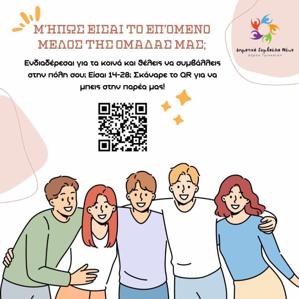 Κάλεσμα σε νέους και νέες του Δήμου Τρικκαίων, για συμμετοχή στο Μητρώο Μελών του Δημοτικού Συμβουλίου Νέων, απευθύνει το Σώμα. Συγκεκριμένα αναφέρει: Νέοι του Δήμου Τρικκαίων εάν είστε ηλικίας από 14 έως 28 ετών, έχετε την ευκαιρία να συμμετάσχετε ενεργά στα κοινά του δήμου μας, εγγραφόμενοι στο Μητρώο του Δημοτικού Συμβουλίου Νέων του Δήμου Τρικκαίων για τη νέα θητεία 2024-2025. Η συμμετοχή σας είναι κρίσιμη για την ανάπτυξη και τη βελτίωση της πόλης μας.