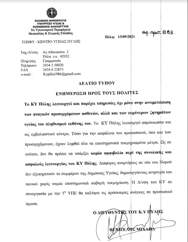 Με ανακοίνωσή της η διεύθυνση του Κέντρου Υγείας Πύλης επιχειρεί να καθησυχάσει τους πολίτες μετά την εκδήλωση κρουσμάτων κορωνοϊού σε υγειονομικό προσωπικό αυτού.