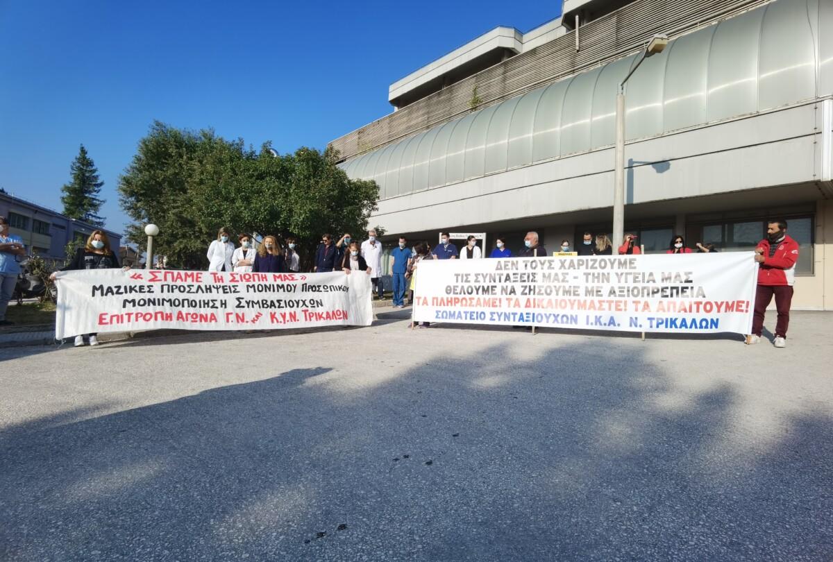 Κινητοποίηση στην Είσοδο Επειγόντων του ΓΝΤρικάλων πραγματοποίησαν εργαζόμενοι του νοσηλευτικού ιδρύματος μετά από κάλεσμα της Επιτροπής Αγώνα Εργαζομένων στο ΓΝΤ και της Ένωσης Ιατρών Νοσοκομείου & Κέντων Υγείας Τρικάλων (ΕΙΝΚΥΤ). Η κινητοποίηση διοργανώθηκε στα πλαίσια της 24ωρης πανυγειονομικής απεργίας της ΟΝΓΕ και της ΠΟΕΔΗΝ. Στους υγειονομικούς συμπαραστάθηκαν με την παρουσία τους και εκπρόσωποι σωματείων και μαζικών φορέων , όπως το σωματείο Συνταξιούχων ΙΚΑ.