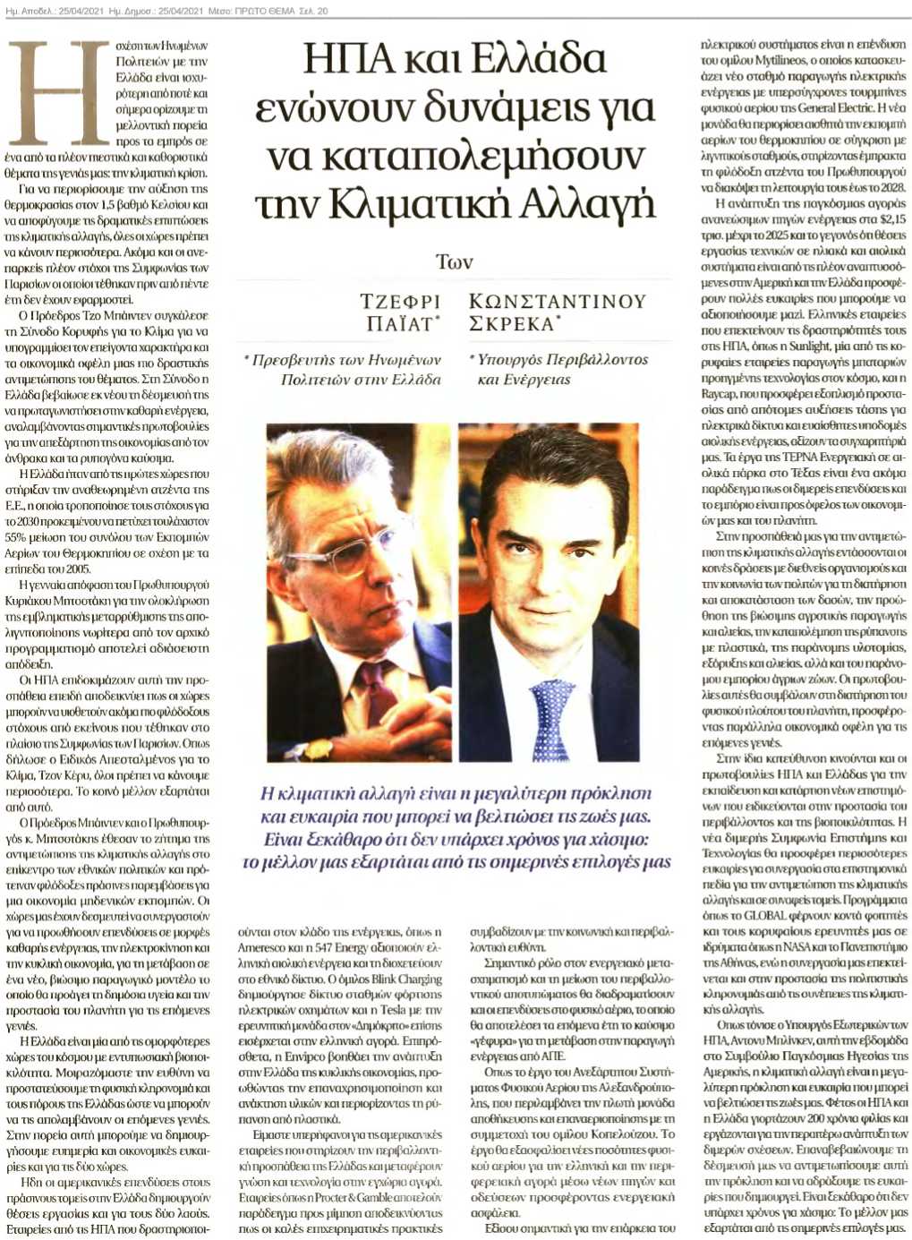 Στο άρθρο επισημαίνεται ότι ο Έλληνας Πρωθυπουργός Κυριάκος Μητσοτάκης και ο Αμερικανός Πρόεδρος Τζο Μπάιντεν έχουν θέσει το ζήτημα της κλιματικής κρίσης στο επίκεντρο των εθνικών πολιτικών τους και έχουν προτείνει φιλόδοξες πράσινες παρεμβάσεις για μια οικονομία μηδενικών εκπομπών. Οι δύο χώρες, όπως τονίζουν οι κ.κ. Σκρέκας και Πάιατ στο άρθρο τους, έχουν δεσμευτεί να συνεργαστούν για να προωθήσουν επενδύσεις σε μορφές καθαρής ενέργειας, στην ηλεκτροκίνηση και την κυκλική οικονομία για τη μετάβαση σε ένα νέο, βιώσιμο παραγωγικό μοντέλο, το οποίο θα προάγει τη δημόσια υγεία και την προστασία του πλανήτη για τις επόμενες γενιές.