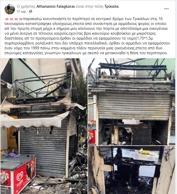Δεν ήταν μόνο το σοκ που υπέστη η οικογένεια από την καταστροφή του μοναδικού πόρου που είχε για να ζήσει, αλλά και το… μπλέξιμο μετέπειτα με τις αρμόδιες αρχές του Δήμου Τρικκαίων.