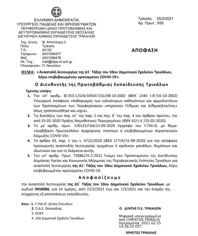 Συγκεκριμένα και όπως καταγράφει το trikalavoice.gr έπειτα από επιβεβαιωμένο κρούσμα κορωνοϊού αναστέλλεται για 14 μέρες και μέχρι τις 7 Μαρτίου η λειτουργία της Δ1΄ Τάξης του 10ου Δημοτικού Σχολείου Τρικάλων. Ακολουθεί αναλυτικά η απόφαση του διευθυντή Α/θμιας Εκπαίδευσης Χρήστου Τρικάλη: