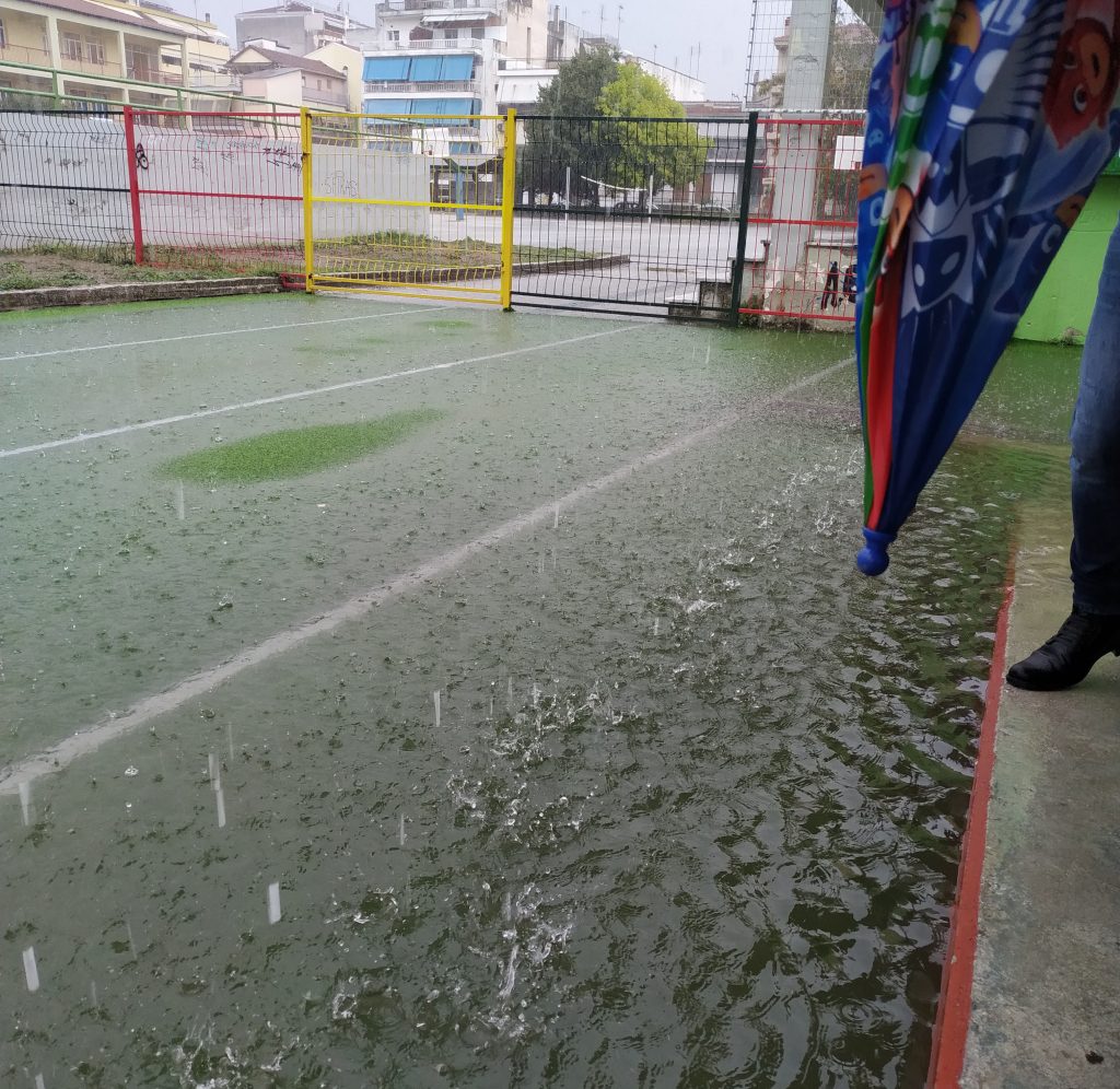 Σε λίμνη μετατράπηκε χθες και ο προαύλιος χώρος του 31ου νηπιαγωγείου Τρικάλων, στο κέντρο της πόλης, επί της οδού Ιάσονος.